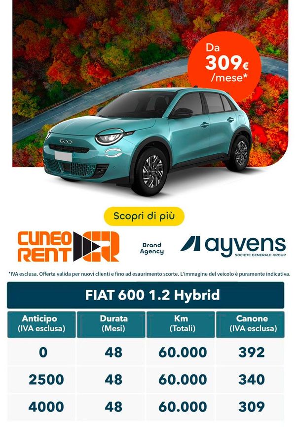 La nuova Fiat 600 Hybrid rappresenta la perfetta sintesi tra design Made in Italy e tecnologia ibrida intelligente. Il motore 1.2 da 110 CV con sistema mild hybrid offre una guida fluida e brillante, ideale per l’uso urbano e i viaggi extraurbani. Comfort, connettività e sicurezza ai massimi livelli, con la praticità del noleggio a lungo termine: un’unica quota mensile per vivere l’evoluzione della mobilità sostenibile.